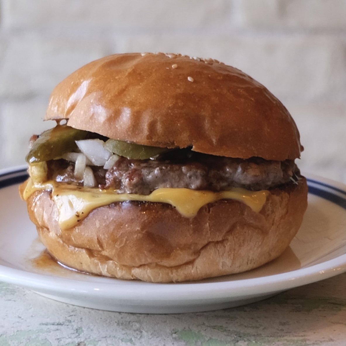 (mustard,lettuce,tomato,onion,relish,patty,S&P,chili,jalapeño,cheddar cheese,homemade mayo.)